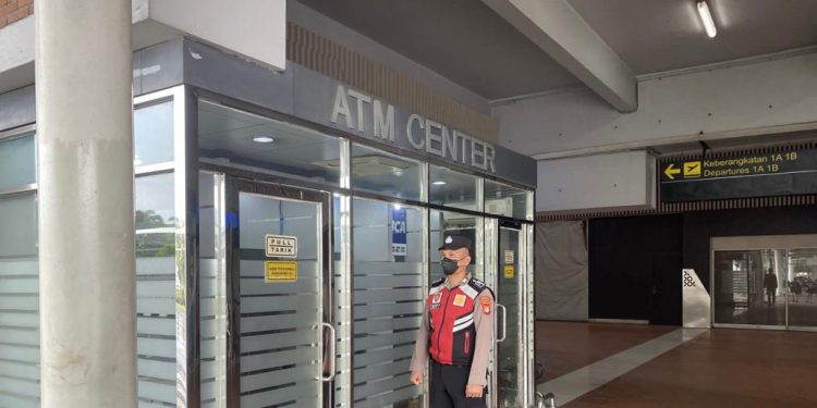 Jakarta – Area ATM center di terminal 1 Bandara Soekarno – Hatta (Soetta), Tangerang didatangi aparat kepolisian berseragam lengkap pada Sabtu (2/12) siang.