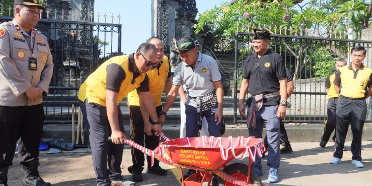 JAKARTA – Kapolres Metro Jakarta Utara Kombes Pol Gidion Arif Setyawan memimpin kegiatan bakti Religi di tempat peribadatan umat Hindu daerah Semper, Cilincing, Jumat (14/6).