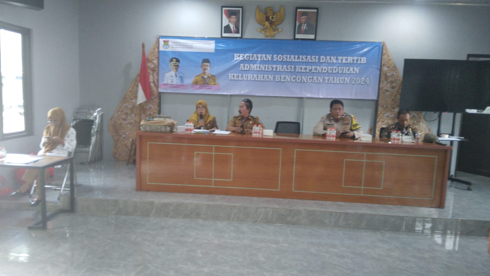 TANGERANG SELATAN – Bhabinkamtibmas Kelurahan Bencongan, Aiptu Sudiro, turut serta dalam acara sosialisasi dan tertib administrasi kependudukan yang diselenggarakan di wilayahnya. Acara ini dihadiri oleh sejumlah tokoh masyarakat dan unsur terkait, termasuk Plt Lurah Bencongan, Kasi Pol PP, Kasi Pemerintahan, Ketua Forum RW, serta para ketua RW se-Kelurahan Bencongan.