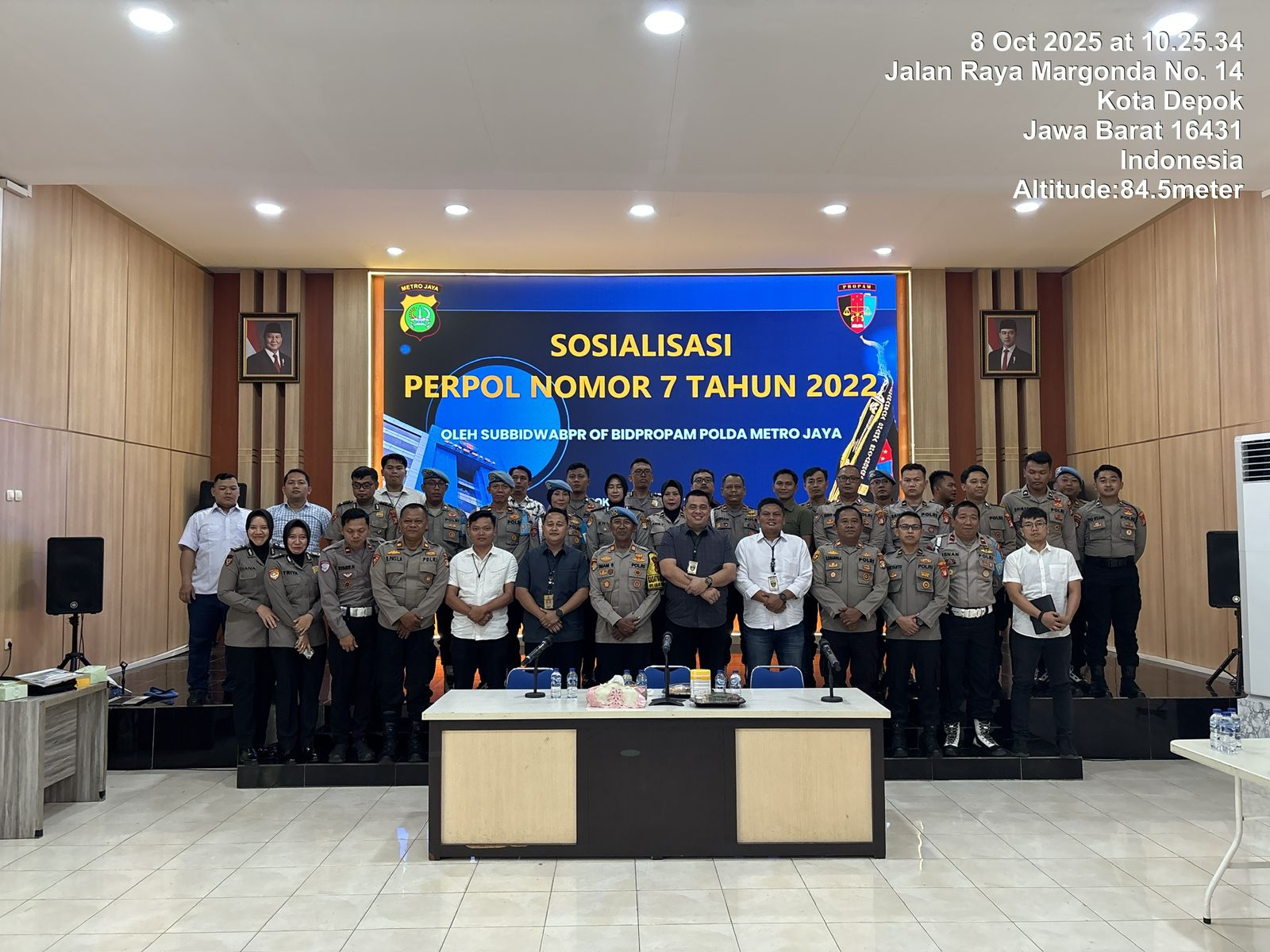 Depok – Dalam upaya memperkuat profesionalisme dan integritas anggota Polri, Bidpropam Polda Metro Jaya menggelar kegiatan Pembinaan Etika Profesi Polri Tahun Anggaran 2025 sekaligus sosialisasi beberapa regulasi penting di lingkungan kepolisian. Kegiatan ini dilaksanakan di Aula Atmani Adhy Polres Metro Depok, Rabu (8/10/2025).