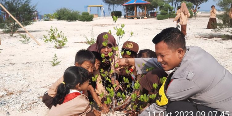 POLDA METRO JAYA – Anggota Polsek Kepulauan Seribu Selatan melalui Bhabinkamtibmas Pulau Lancang Briptu Tulus, mengajak para pelajar sekolah dasar Pulau Lancang melaksanakan aksi menanam puluhan bibit pohon untuk mengurangi tingkat polusi udara di Pulau Lancang, Kepulauan Seribu, pada Rabu (11/10/2023).
