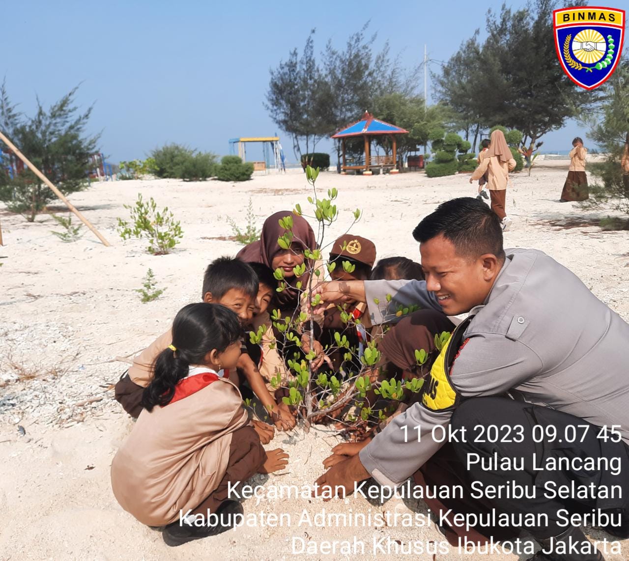 POLDA METRO JAYA – Anggota Polsek Kepulauan Seribu Selatan melalui Bhabinkamtibmas Pulau Lancang Briptu Tulus, mengajak para pelajar sekolah dasar Pulau Lancang melaksanakan aksi menanam puluhan bibit pohon untuk mengurangi tingkat polusi udara di Pulau Lancang, Kepulauan Seribu, pada Rabu (11/10/2023).