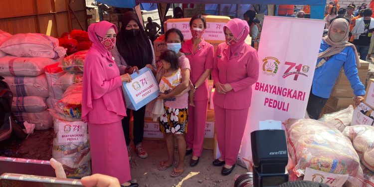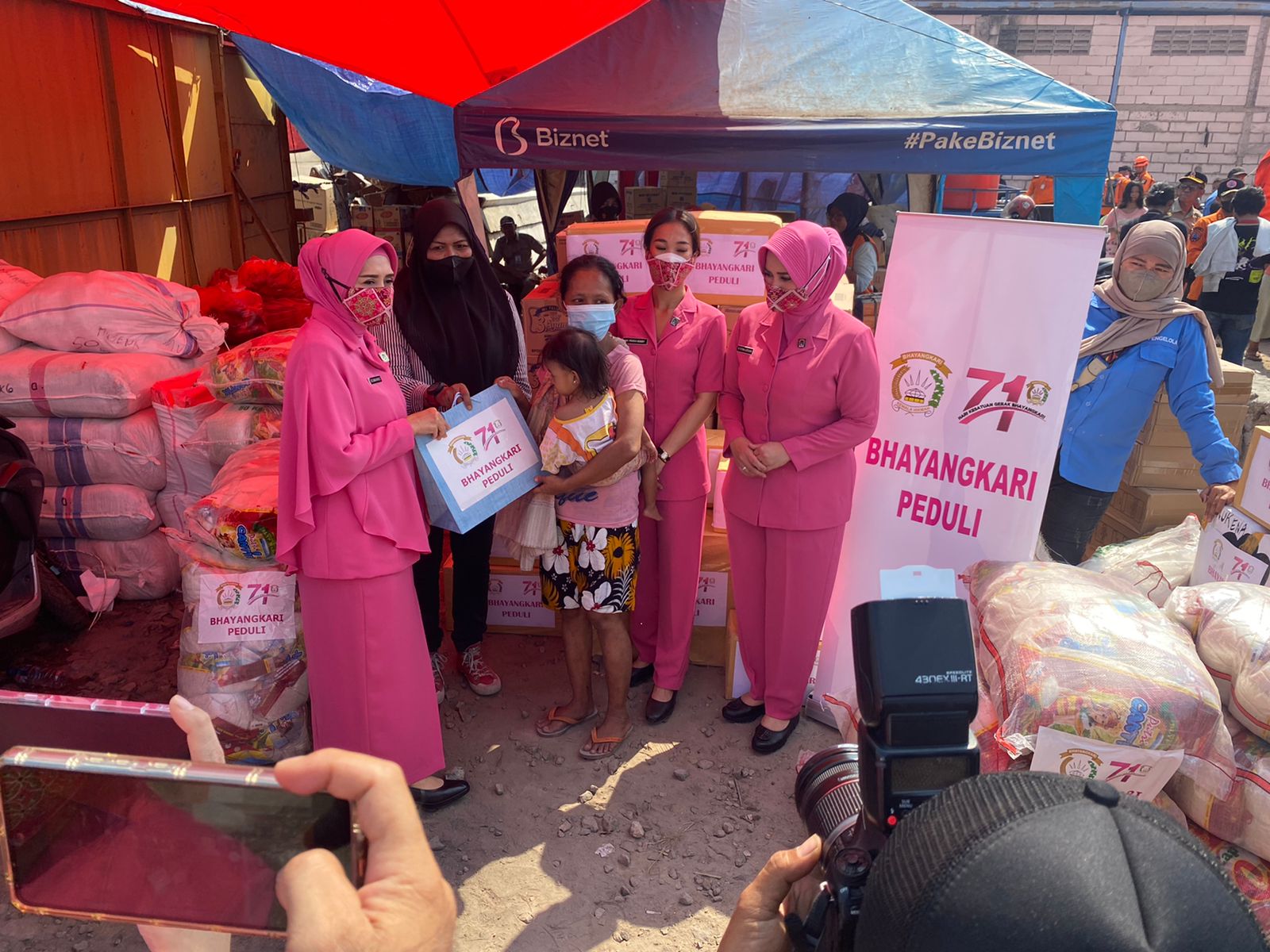 POLDA METRO JAYA – Ibu-ibu Kemala Bhayangkari dan cabang Polsek Metro Penjaringan serta Polres Jakarta Utara menyambangi lokasi penampungan pengungsi korban kebakaran di Jl. Kapuk Utara I Rt.001/003, Kel. Kapuk Muara, Kec. Penjaringan, Jakarta Utara, Senin (31/7/2023) siang