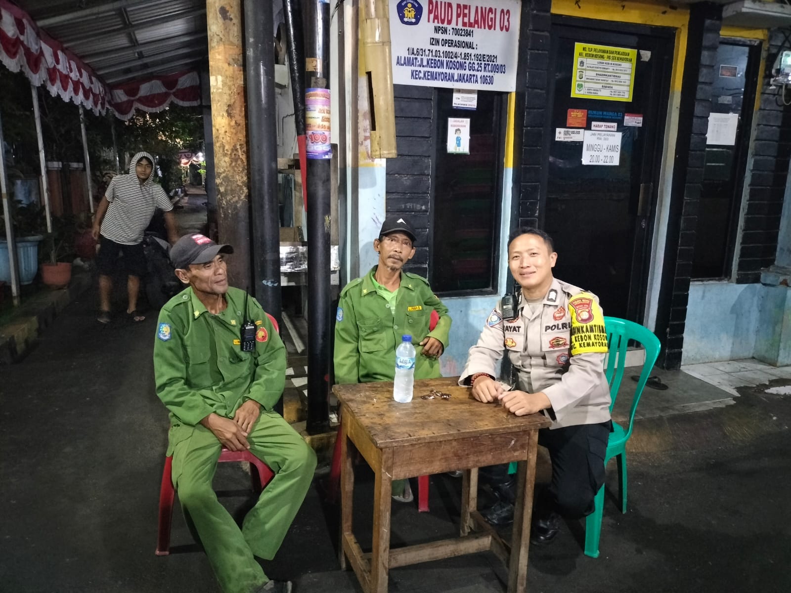Jakarta Pusat – Bhabinkamtibmas Kelurahan Kebon Kosong, Brigadir Yayat Ruhiyat, melaksanakan monitoring sistem keamanan lingkungan (siskamling) di Pos RW 03, Jalan Kebon Kosong Gang 25, Kemayoran, Jakarta Pusat, Selasa (30/9/2025) dini hari.