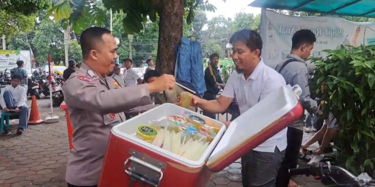 Jakarta – Sebagai wujud kepedulian dan bentuk berbagi sesama, Bhabinkamtibmas Polsek Ciracas membagikan minuman gratis kepada jemaah sholat Jumat.