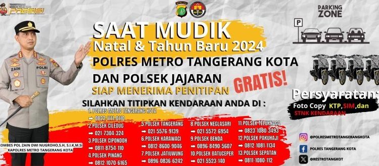 Jakarta – Kabar baik bagi warga Tangerang di wilayah hukum Polres Metro Tangerang Kota, Polda Metro Jaya yang berencana melakukan mudik perayaan Natal 2023 dan Tahun Baru 2024 (Nataru) dapat menitipkan kendaraan secara gratis.