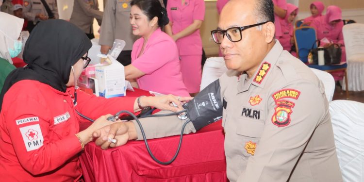 Jakarta – Dalam rangka menyambut Hari Ulang Tahun (HUT) Bhayangkara yang ke-78, Polres Metro Jakarta Utara dan Bhayangkari Cabang Jakarta Utara menggelar Baksos donor darah di lobby Polres Metro Jakarta Utara, Rabu. (26/6).