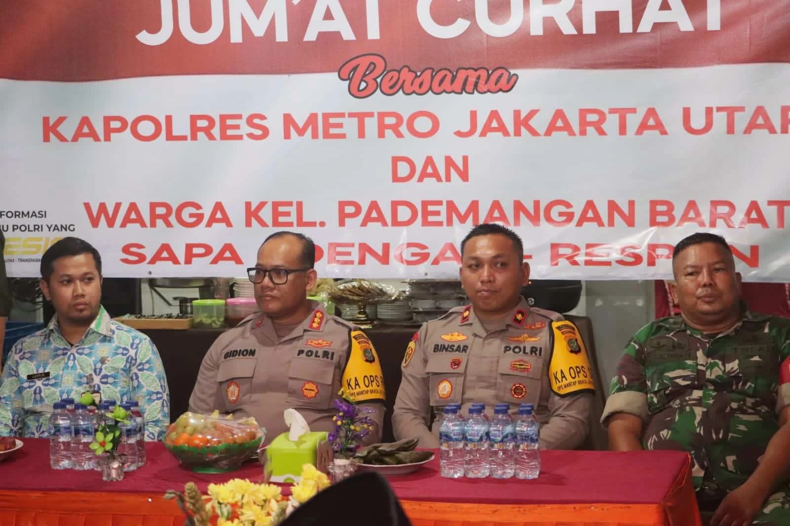 Jumat Curhat dihadiri PJU Polres Metro Jakbar Kabagops AKBP Ahmad Akbar, Kasat Intelkam AKBP Ananto Herlambang, Kasat Reskrim AKBP Hady Saputra Siagian, Kasat Narkoba AKBP Prasetyo Noegroho, Kapolsek Pademangan Kompol Binsar Hatorangan Sianturi, Kasat Binmas AKBP Agus Rizal serta para anggota Jajaran Polres Metro Jakarta Utara