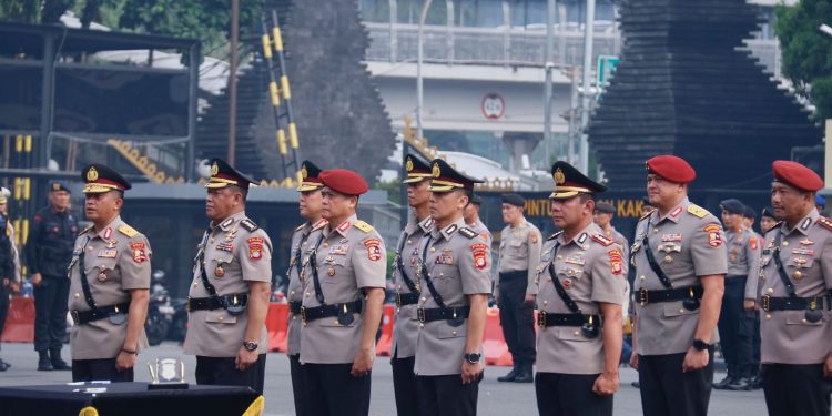 Jakarta – Kapolda Metro Jaya Irjen Pol. Karyoto pimpin upacara Serah Terima Jabatan Karoops, Karolog, Dirintelkam, Dirreskrimum dan Dirpamobvit di lapangan Presisi Ditlantas Polda Metro Jaya, Jumat (29/12/23) pagi.