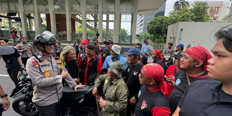 Jakarta – Kapolda Metro Jaya Irjen Pol. Karyoto dan Wakapolda Metro Jaya Brigjen Pol Suyudi Ario Seto bersama PJU Polda Metro Jaya turun tangan ikut mengamankan aksi penyampaian pendapat Buruh dan aliansi masyarakat untuk memperingati Hari Buruh Internasional (Mayday) di Patung Kuda dan Bunderan HI Jakarta Pusat. Rabu (1/5/2024).