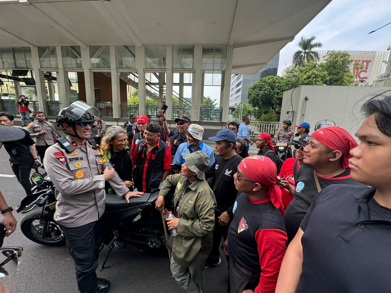 Jakarta – Kapolda Metro Jaya Irjen Pol. Karyoto dan Wakapolda Metro Jaya Brigjen Pol Suyudi Ario Seto bersama PJU Polda Metro Jaya turun tangan ikut mengamankan aksi penyampaian pendapat Buruh dan aliansi masyarakat untuk memperingati Hari Buruh Internasional (Mayday) di Patung Kuda dan Bunderan HI Jakarta Pusat. Rabu (1/5/2024).