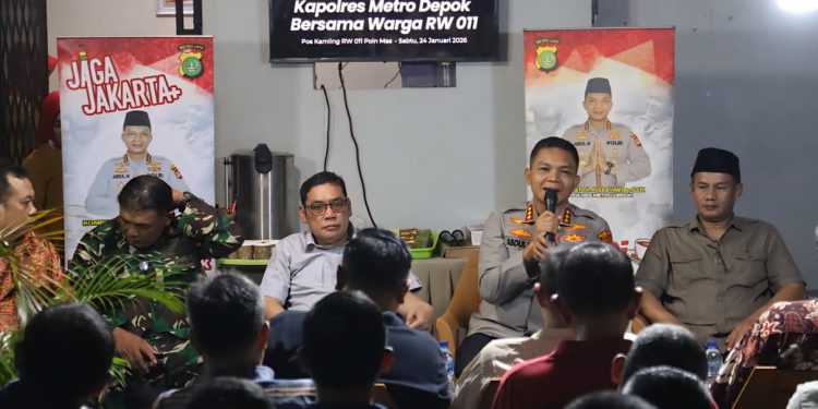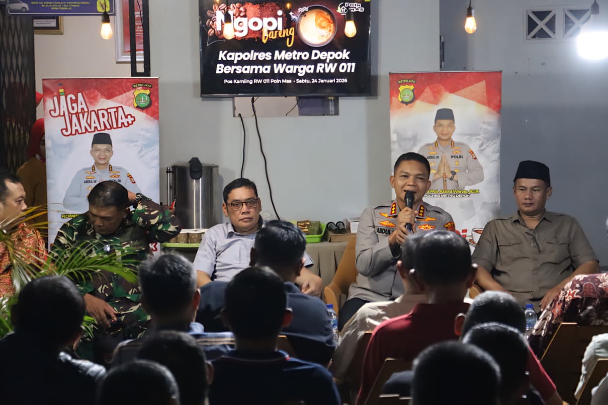 Depok – Dalam rangka mempererat silaturahmi serta menjaga situasi keamanan dan ketertiban masyarakat (Kamtibmas), Kapolres Metro Depok Kombes Pol Abdul Waras, S.I.K. memimpin kegiatan Ngopi Kamtibmas bersama warga di Pos Satkamling RT 03 RW 11 Perumahan Poin Mas, Kelurahan Rangkapan Jaya, Kecamatan Pancoran Mas, Kota Depok, Sabtu malam (24/01/2026).