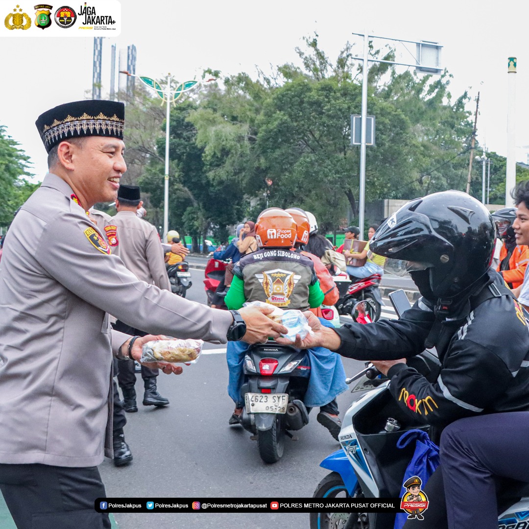 Menjelang waktu berbuka puasa, jajaran Polres Metro Jakarta Pusat bersama Polsek Metro Tanah Abang juga turun langsung ke jalan untuk membagikan takjil gratis kepada masyarakat dan pengguna jalan. Aksi berbagi tersebut disambut antusias warga yang melintas, sekaligus menjadi bentuk kepedulian dan kedekatan Polri dengan masyarakat di bulan penuh berkah.
