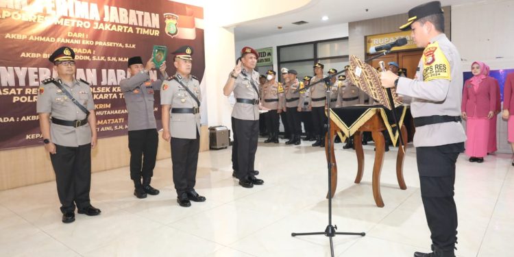 Jakarta – Kapolres Metro Jakarta Timur Kombes Pol. Leonardus Simarmata memberikan pesan saat memimpin langsung serah terima jabatan (Sertijab) Wakapolres Metro Jakarta Timur dari AKBP Ahmad Fanani Eka Prasetya, SIK kepada AKBP Burhanuddin, S.I.K., S.H., M.H.
