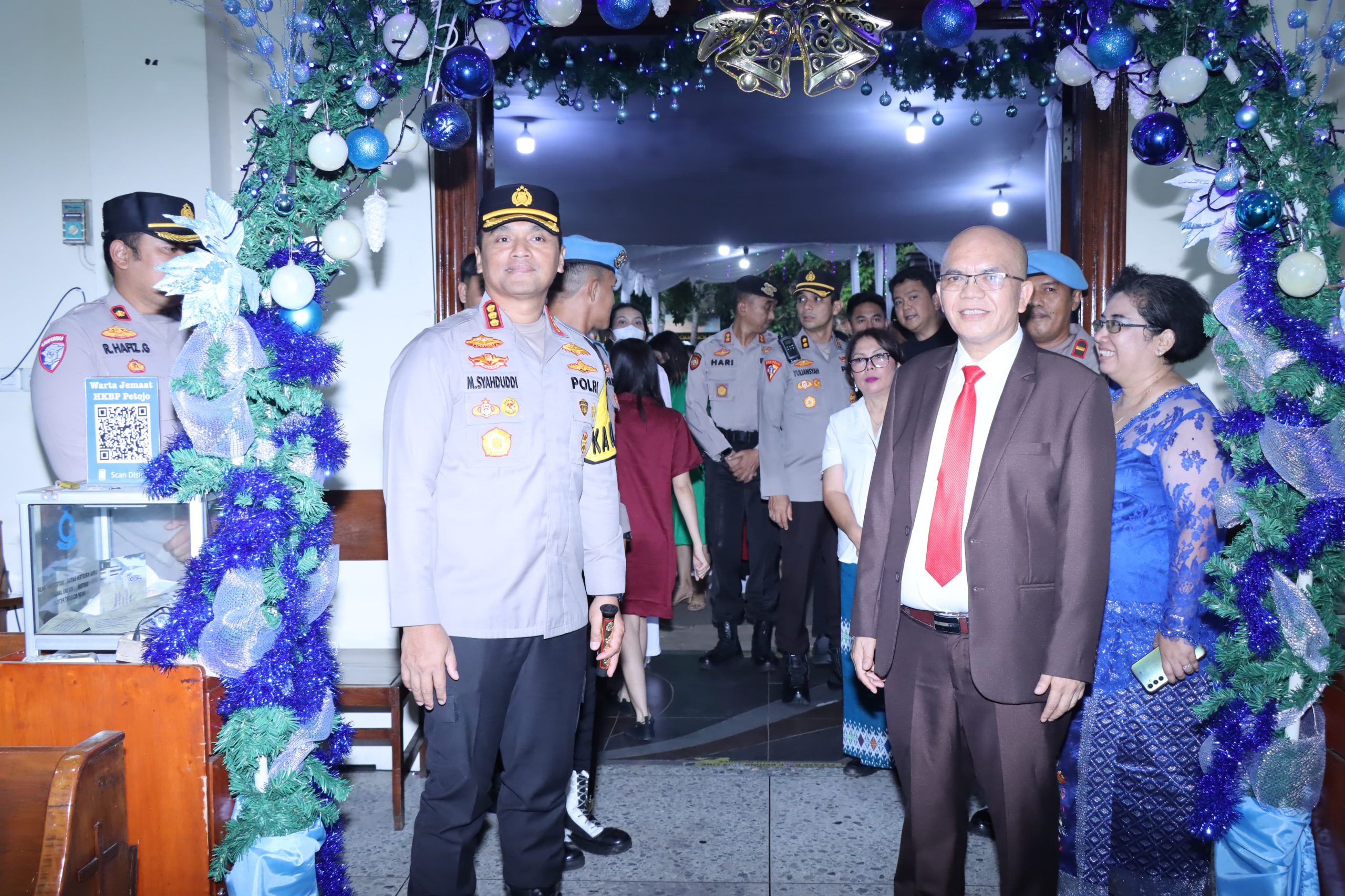 Kombes Pol Syahduddi menyempatkan diri berinteraksi dengan jemaat, menyampaikan pesan Natal, serta memberikan semangat kepada para petugas keamanan yang berjaga di lokasi.
