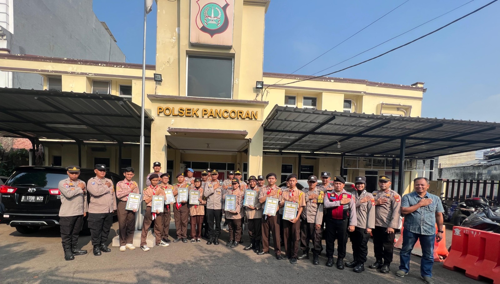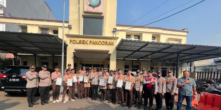 Jakarta – Kepala Kepolisian Sektor Pancoran Polres Metro Jakarta Selatan, Kompol Sujarwo, SH, MH memberikan penghargaan piagam kepada Pramuka Saka Bhayangkara Kecamatan Pancoran di Mapolsek Pancoran, Jakarta Selatan