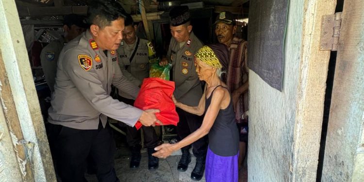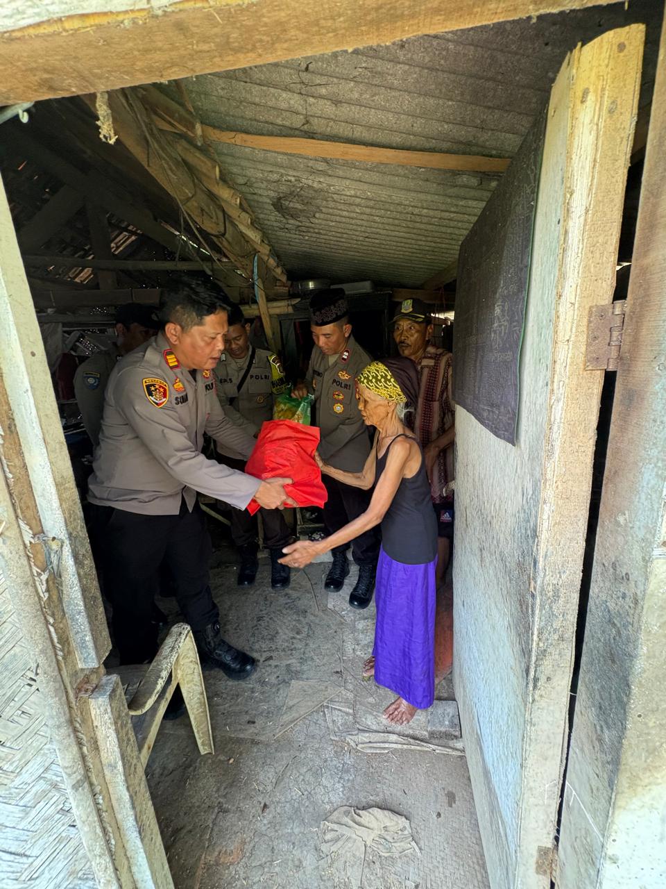 Kapolsek Pebayuran AKP Iing Suhaeri, S.H., M.H., didampingi Kanit Binmas Aiptu Triyono, personel Polsek Pebayuran, serta Ketua RT 02/04 Desa Sumbersari, menyambangi kediaman Mak Lemih (75), warga Kampung Bojong Poncol, Desa Sumbersari, Kecamatan Pebayuran.