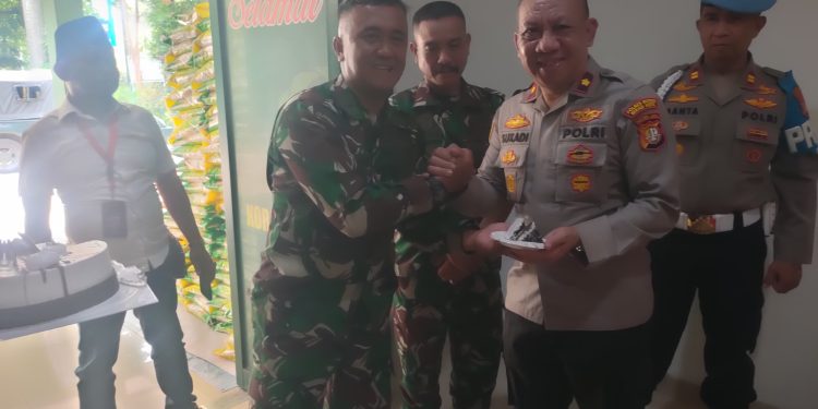 Kapolsek menyerahkan kue ulang tahun dan tumpeng sebagai bentuk apresiasi serta penghargaan atas dedikasi dan pengabdian TNI kepada bangsa dan negara.