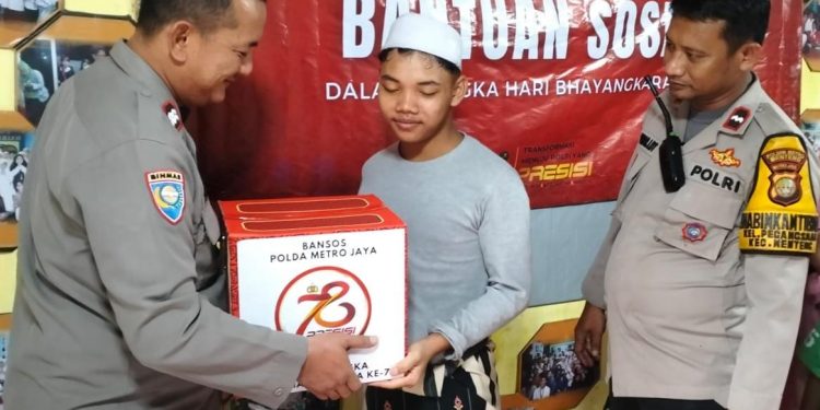 Jakarta Pusat – Aiptu Roby Danan Jaya Putra Bhabinkamtibmas Kelurahan Menteng dan Aipda Anwar Bhabinkamtibmas Kelurahan Pegangsaan membagikan bantuan sosial berupa paket sembako yang dibagikan kepada anak-anak Yatim Piatu. Rabu (19/6/2024).
