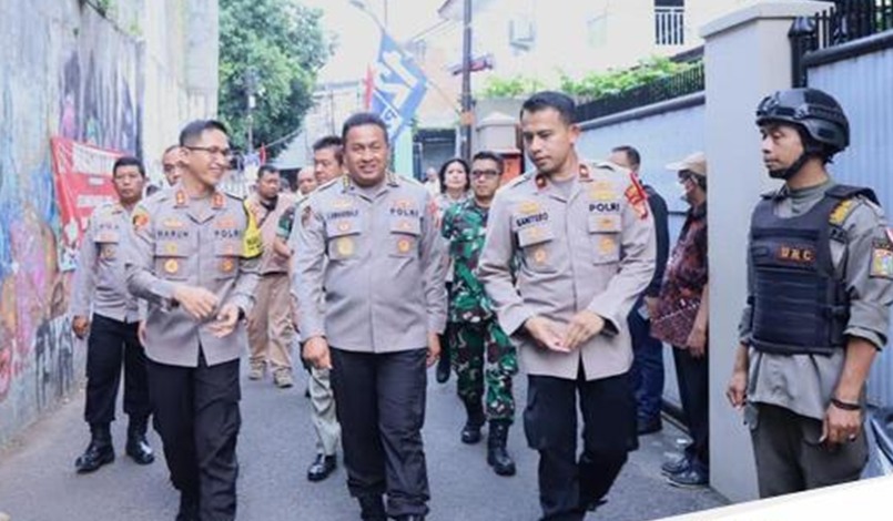 Jakarta – Karo SDM Polda Metro Jaya KBP Langgeng Purnomo dan Kapolsek Mampang Prapatan Prapatan Kompol David Kanitero beserta jajaran meninjau dan melakukan asistensi pengamanan ibadah Natal 2023 di Gereja Baptis Independen Indonesia (GBII) Pertama, Prapatan, Jakarta Selatan. David memastikan seluruh gereja di Mampang aman.