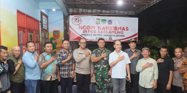 Jakarta – Kapolres Metro Jakarta Utara Kombes Pol Gidion Arif Setyawan dan Dandim 0502/JU Kolonel Kav. Tofan Tri Anggoro Ngopi Kamtibmas bersama warga di RW 06, Sunter Agung, Tanjung Priok, Rabu (26/6) malam.