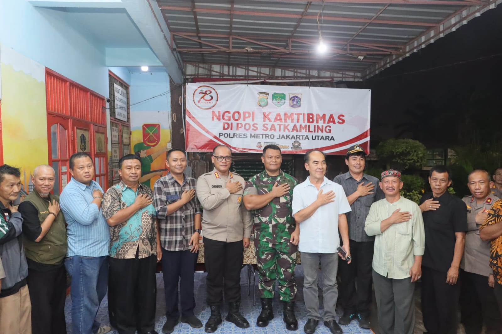 Jakarta – Kapolres Metro Jakarta Utara Kombes Pol Gidion Arif Setyawan dan Dandim 0502/JU Kolonel Kav. Tofan Tri Anggoro Ngopi Kamtibmas bersama warga di RW 06, Sunter Agung, Tanjung Priok, Rabu (26/6) malam.