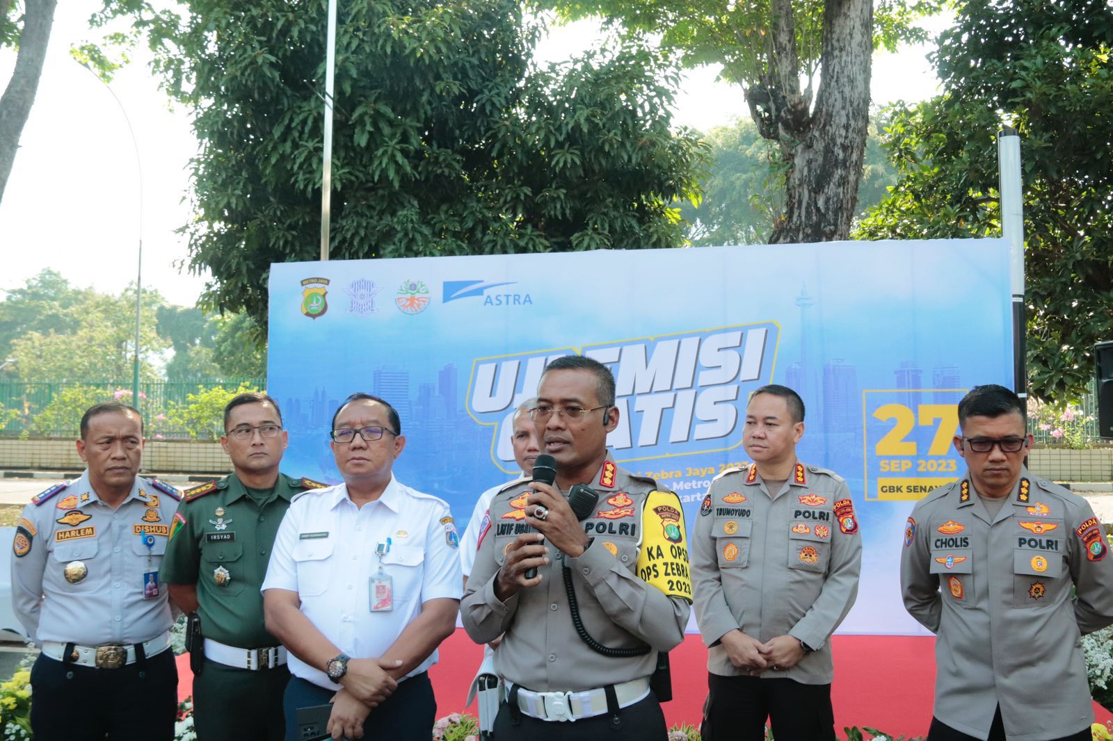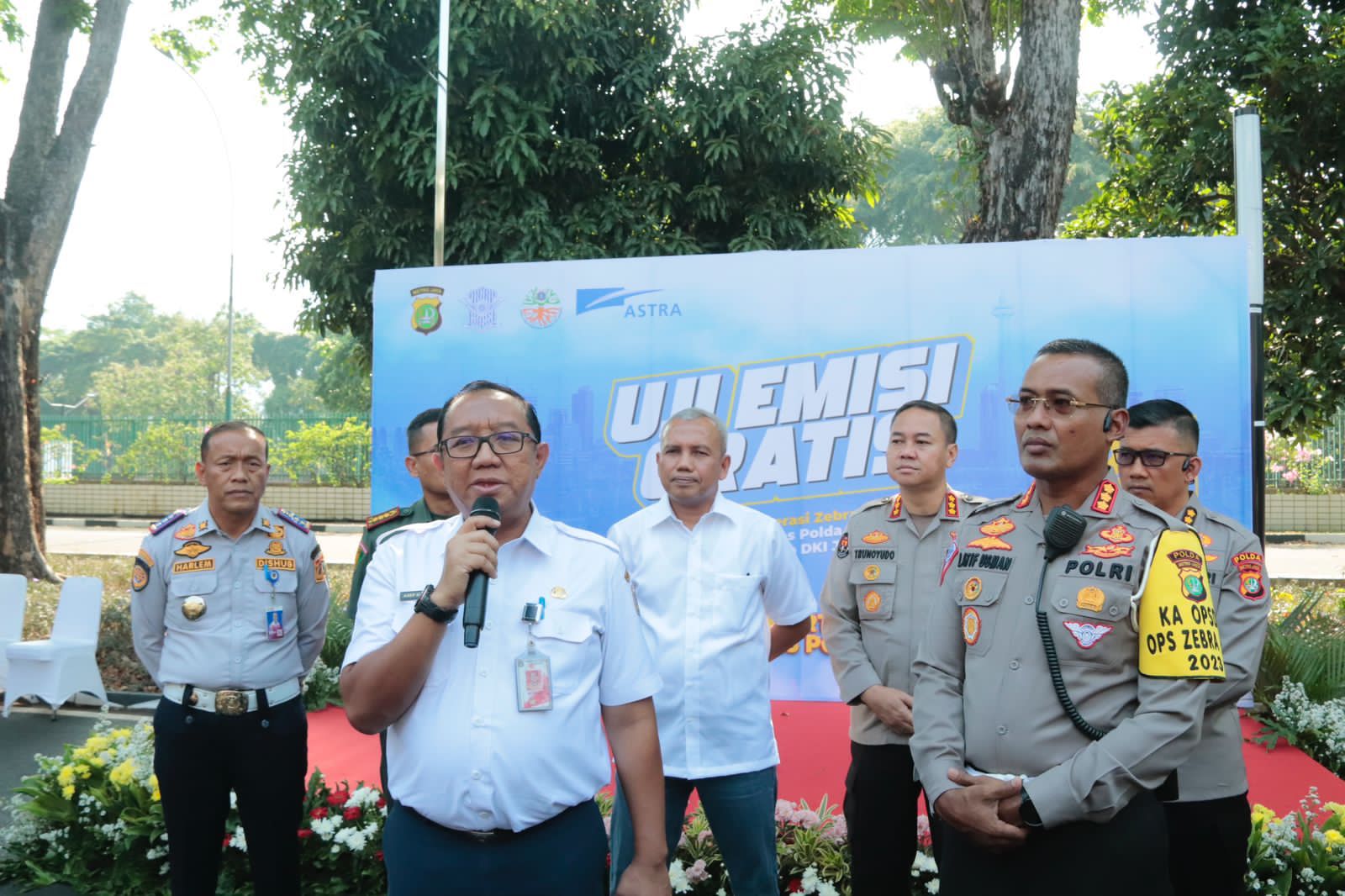 “Pada pagi hari ini kita Jajaran Ditlantas Polda Metro Jaya dalam rangka Operasi Zebra Jaya 2023 dari satgas Preemtif ada kegiatan yang memang agak berbeda yaitu dengan kondisi udara Jakarta saat ini, kami ikut berpartisipasi untuk mengendalikan polusi udara, yaitu bekerja sama dengan Kementrian Lingkungan Hidup (KLH) dan PT. Astra untuk melaksanakan uji emisi gratis kepada seluruh masyarakat yang ada di Jakarta” Katanya.