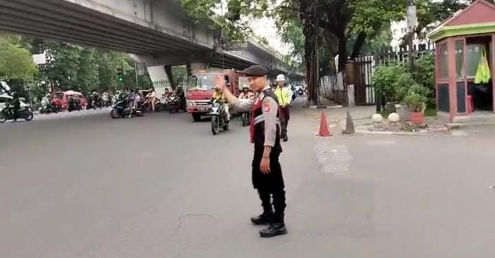 Pengaturan lalu lintas dilakukan di Taman Green Garden, jalan raya Daan Mogot Jakarta Barat, sekitar pukul 06.30 pagi.