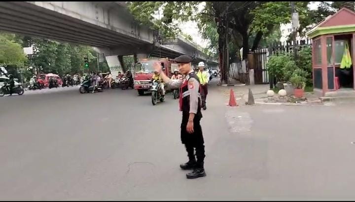 Jakarta Barat – Personel Samapta Polres Metro Jakarta Barat melaksanakan pengaturan arus lalu lintas saat jam berangkat kerja masyarakat, Rabu, 24/4/2024.