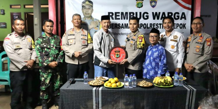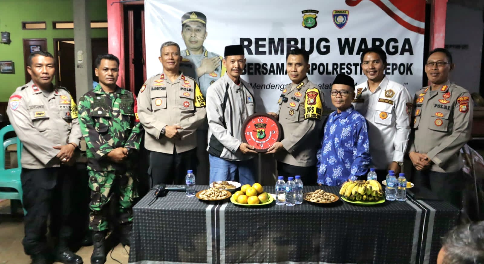 Depok – Plh. Kapolres Metro Depok Kombes Pol. Ardiyanto, S.I.K., M.H, menggelar Rembug Warga Dengan Tema “Mendengar, Mencatat dan Mencari Solusi” yang dilaksanakan di halaman rumah Ibu Waginah Jl. Katim Plaza RT.04 RW 07 No. 62 Kel. Kalimulya Kec. Cilodong Kota Depok. Sabtu (20/01/24).