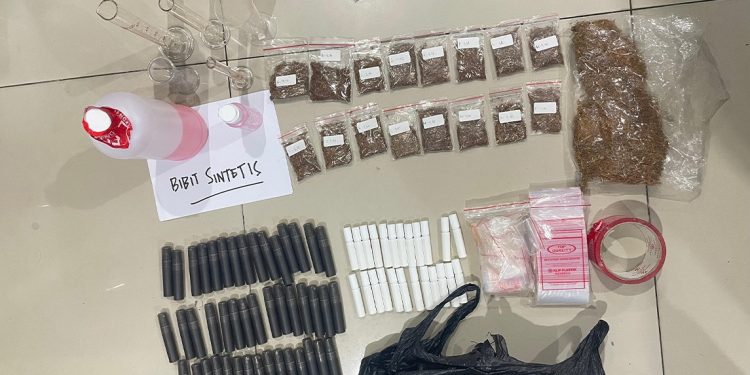 Dalam penggerebekan itu, petugas menyita sejumlah barang bukti, di antaranya bibit sintetis cair sebanyak 534 mililiter, tembakau sintetis seberat 72,1 gram, 73 puluhan botol spray, 5 gelas takar berbagai ukuran, satu botol aseton, satu unit telepon genggam, serta bahan-bahan sintetis yang belum jadi.