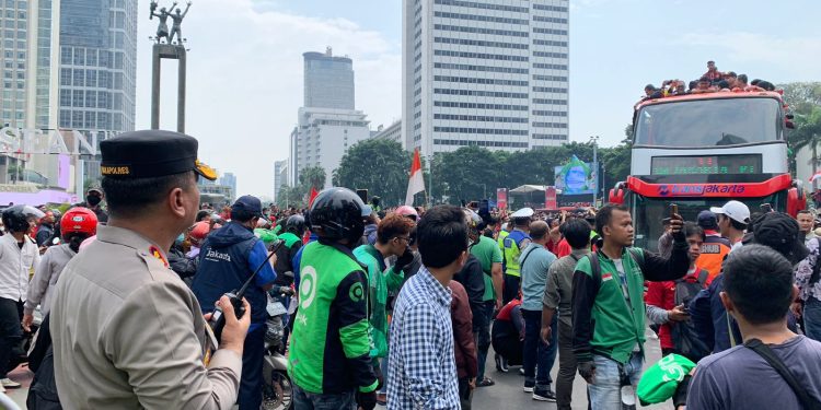 POLDA METRO JAYA– Timnas sepakbola Indonesia U-22 menggelar arak-arakan dari Stadion Utama Gelora Bung Karno (SUGBK) menuju Bundaran HI hari ini. Ratusan personel gabungan disiagakan untuk mengamankan acara tersebut.