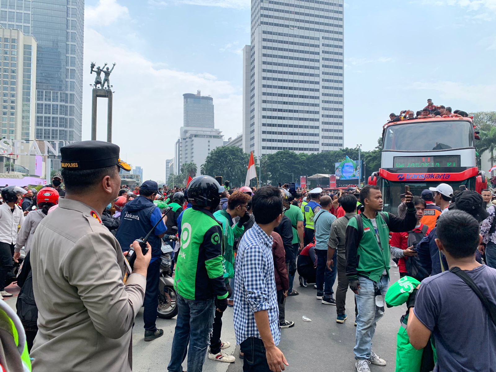 POLDA METRO JAYA– Timnas sepakbola Indonesia U-22 menggelar arak-arakan dari Stadion Utama Gelora Bung Karno (SUGBK) menuju Bundaran HI hari ini. Ratusan personel gabungan disiagakan untuk mengamankan acara tersebut.