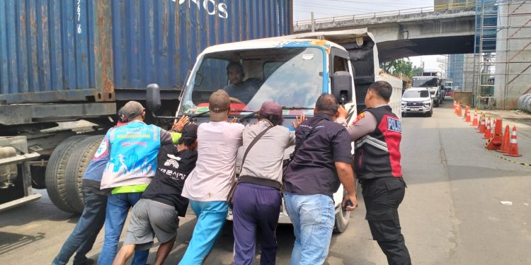 Truk yang tiba-tiba mogok di tengah jalan sempat menyebabkan kemacetan arus lalu lintas di sekitar lokasi. Melihat situasi itu, kedua anggota polisi langsung turun tangan bersama warga sekitar untuk mendorong truk ke pinggir jalan agar arus kendaraan kembali normal.