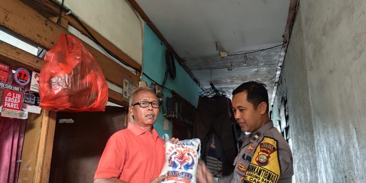 Aipda Tri Pujianto memberikan beras kepada Slamet dan Fitriyani yang merupakan warga kurang mampu di wilayahnya dengan harapan agar perekonomian warga binaannya terbantu.