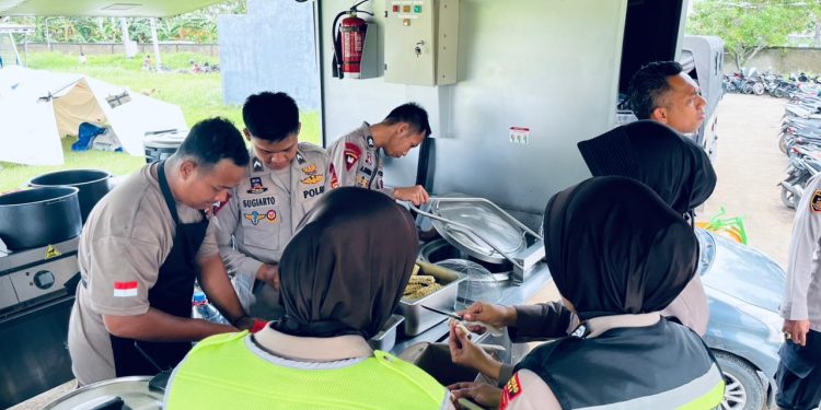 BEKASI – Polres Metro Bekasi bersama Satuan Brimob Den D Polda Metro Jaya mendirikan dapur umum bagi masyarakat terdampak banjir di Kampung Pulodaon RT 001/001, Desa Sukamekar, Kecamatan Sukawangi, Kabupaten Bekasi, Sabtu (24/1/2026).