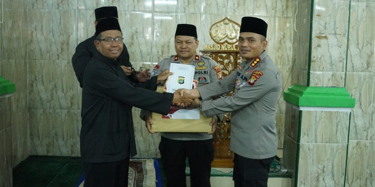 Dalam kegiatan tersebut, Kapolres Metro Bekasi menyerahkan bantuan berupa 25 Al-Qur’an yang diterima langsung oleh Ketua DKM Masjid Nurul Fikri, Bapak Iman Saiman. Kapolres berharap bantuan tersebut dapat bermanfaat bagi jamaah dalam meningkatkan kualitas ibadah dan mempererat silaturahmi antara Polri dengan masyarakat.