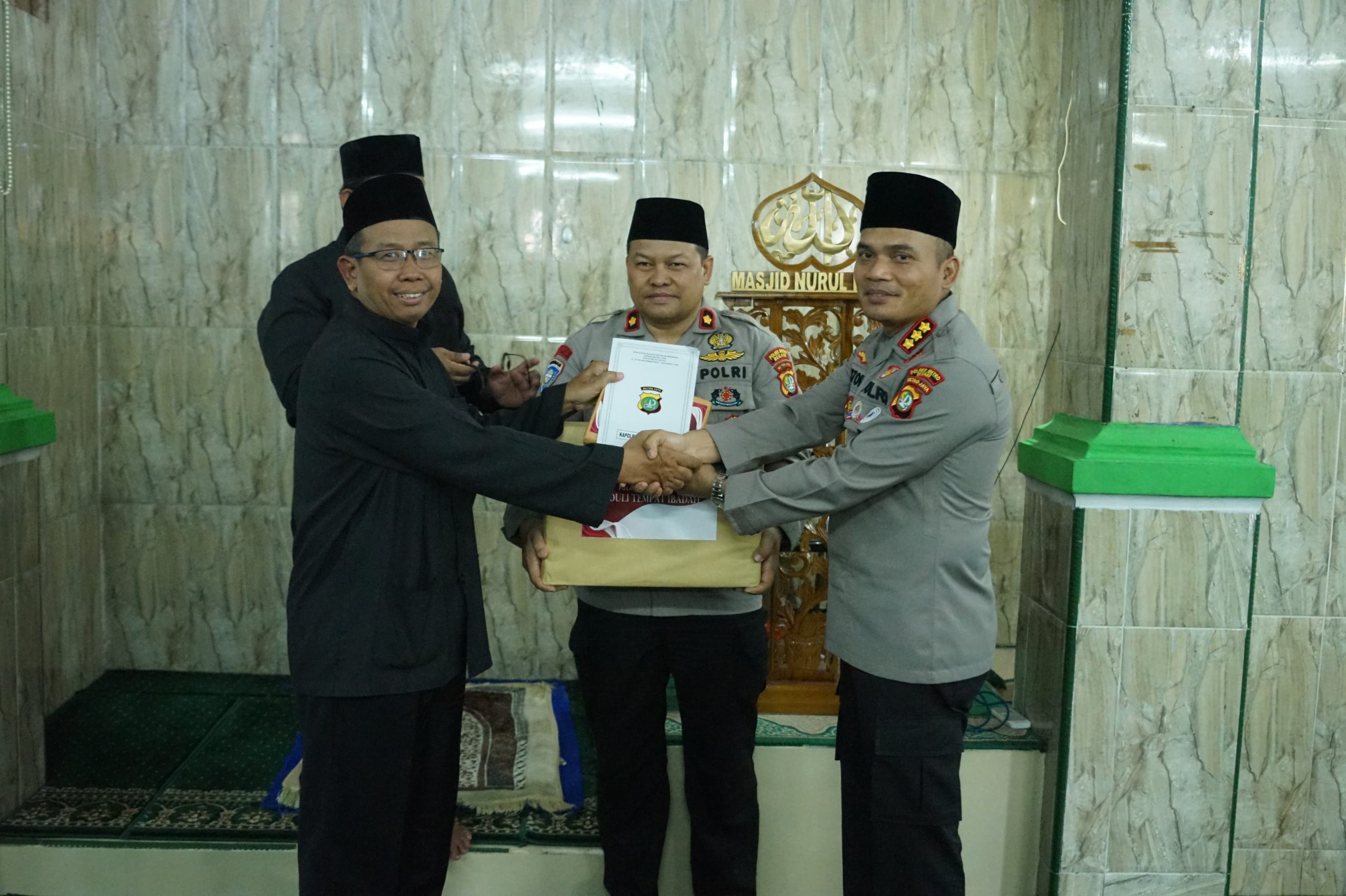 Dalam kegiatan tersebut, Kapolres Metro Bekasi menyerahkan bantuan berupa 25 Al-Qur’an yang diterima langsung oleh Ketua DKM Masjid Nurul Fikri, Bapak Iman Saiman. Kapolres berharap bantuan tersebut dapat bermanfaat bagi jamaah dalam meningkatkan kualitas ibadah dan mempererat silaturahmi antara Polri dengan masyarakat.