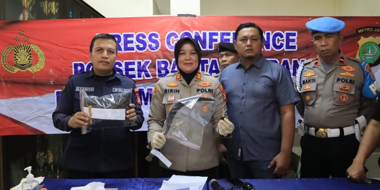 Bekasi – Kapolsek Bantar Gebang AKP Ririn Sri Damayanti didampingi oleh Waka Polsek, Paur Penmas Humas Polres Metro Bekasi Kota dan Panit Opsnal Unit Reskrim Polsek Bantar Gebang, mengadakan Konferensi Pers. Konferensi Pers ini bertujuan untuk memberikan informasi kepada publik mengenai penangkapan dua tersangka yang terlibat dalam kasus pemerasan di wilayah hukum Polsek Bantar Gebang. Selasa(14/5/2024).