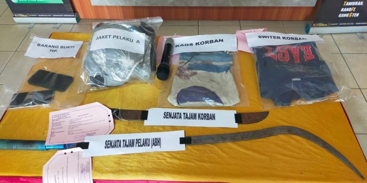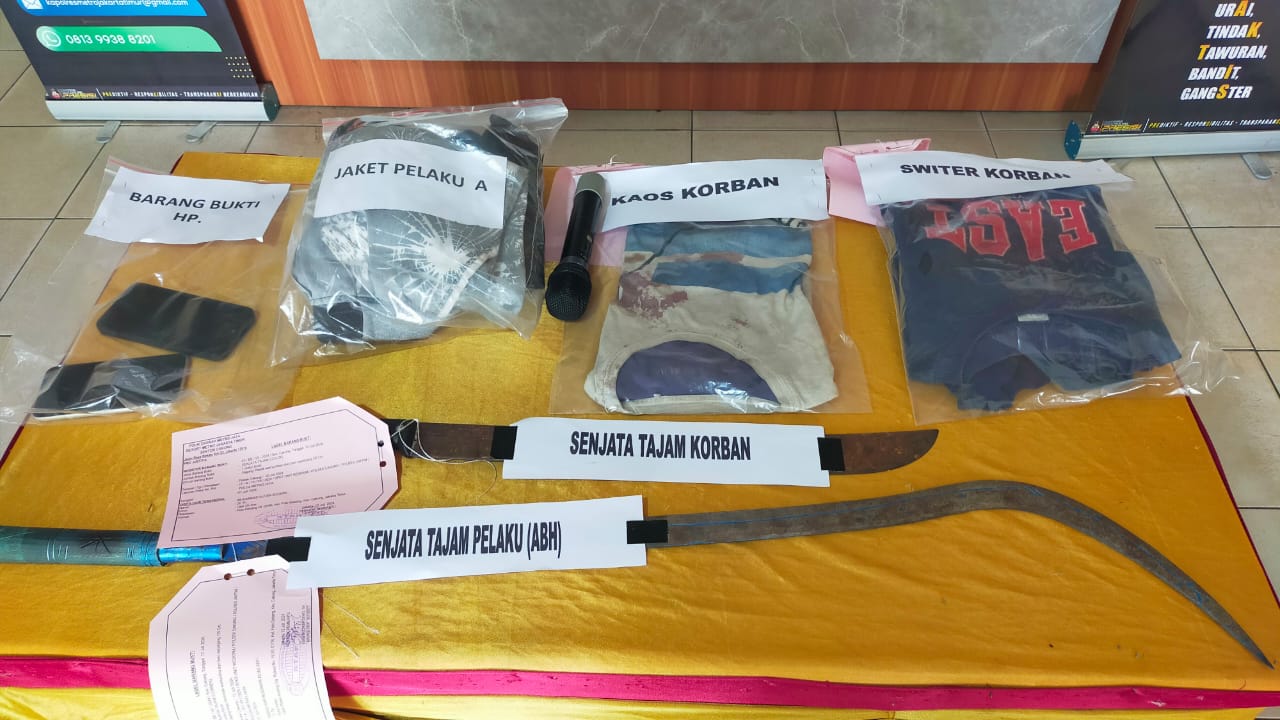Barang bukti yang berhasil diamankan dalam kasus ini antara lain dua bilah senjata tajam, jaket hitam yang digunakan oleh tersangka berinisial H saat kejadian, serta dua unit handphone. Selain itu, polisi telah memeriksa sejumlah saksi dan menahan tersangka untuk proses hukum lebih lanjut.