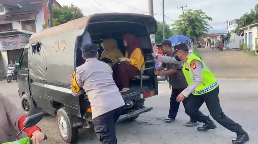 Dalam giat pagi itu, petugas menemukan sebuah angkutan umum yang mendadak mogok di tengah perempatan, sehingga mengganggu arus lalu lintas. Tanpa menunggu lama, IPTU M. Fadli dan Aipda Budi segera mendorong mobil tersebut ke pinggir jalan untuk mengamankan jalur dan memastikan arus lalu lintas kembali lancar.