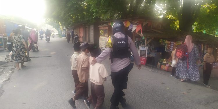 KEDUNG WARINGIN – Polsek Kedung Waringin melaksanakan kegiatan pelayanan masyarakat (Yanmas) pagi dengan melakukan pengaturan lalu lintas (gatur lalin) dan membantu menyeberangkan anak-anak sekolah di Jalan Raya Kedung Waringin – Cipayung, tepat di depan SDN 03 Bojong Sari, Desa Bojong Sari, pada hari Selasa (7/10).