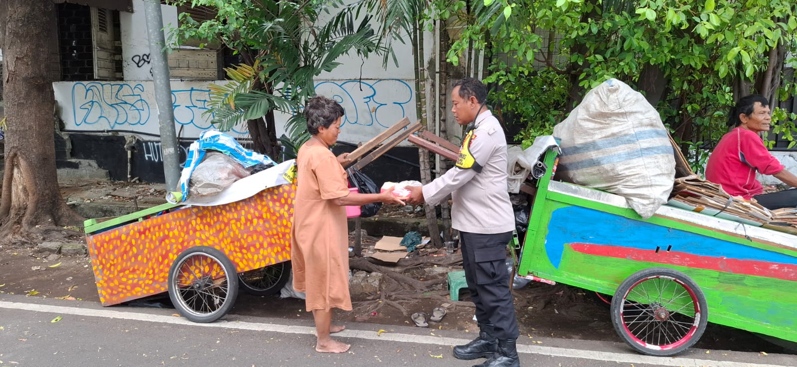 “Kami membagikan 50 bungkus makanan siap saji kepada pemulung dan warga kurang mampu di wilayah Pasar Baru. Walaupun sederhana, kami berharap ini dapat membantu meringankan beban masyarakat,” ujar Kompol Rahmat.