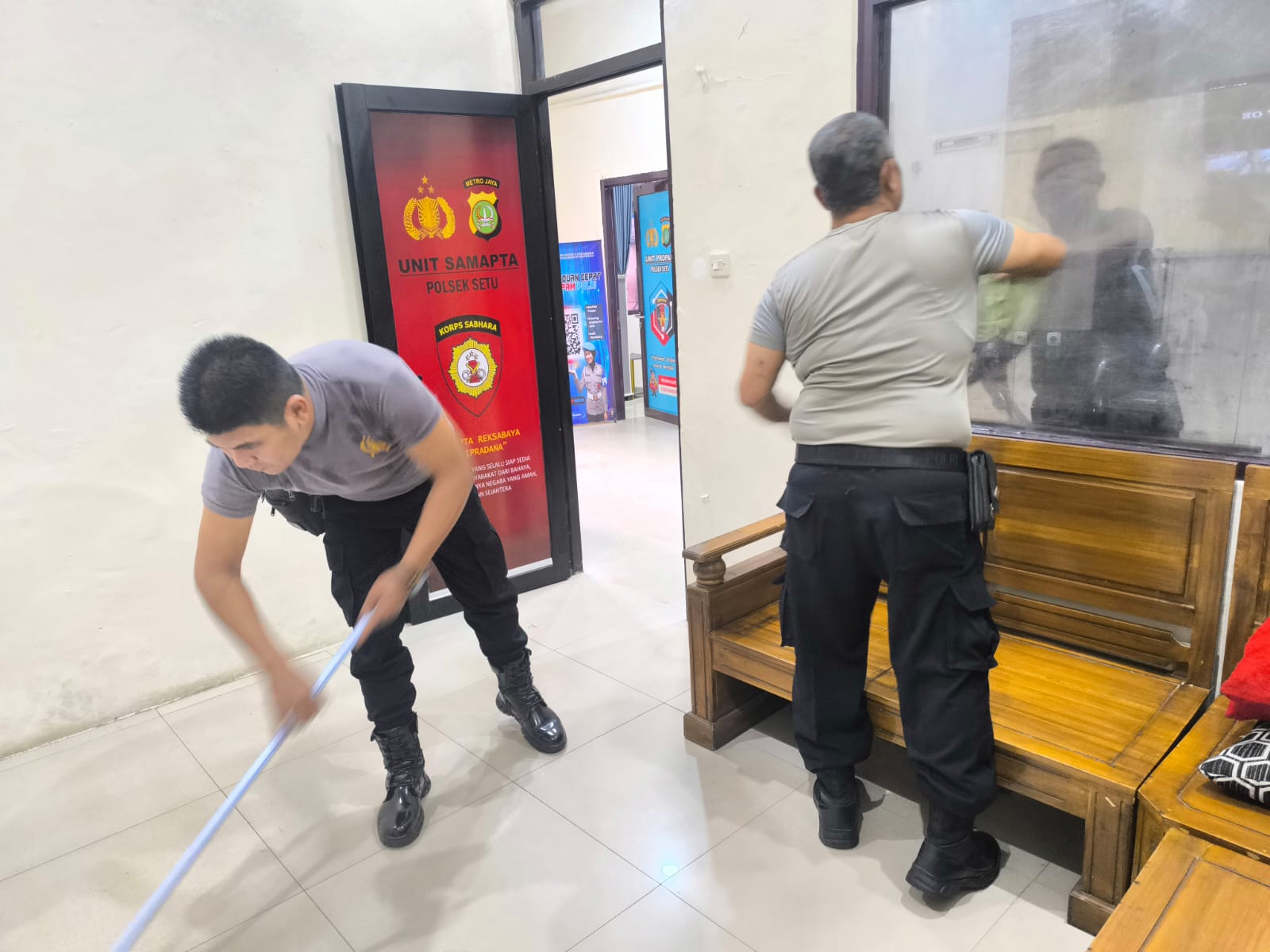 “Sebanyak 17 personel Polsek Setu yang dipimpin Kapolsek melaksanakan kegiatan korve secara menyeluruh, baik di area dalam maupun luar mako. Setelah pembersihan bagian luar, masing-masing unit melanjutkan dengan membersihkan ruangan kerja mereka,” ujar Kombes Pol. Sumarni.