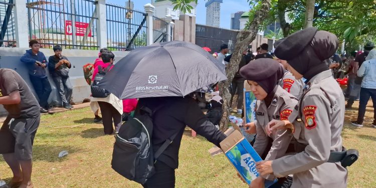 Jakarta – Polri menunjukkan kepeduliannya kepada massa aksi unjuk rasa di depan Gedung DPR/MPR RI, Senayan, Tanah Abang, Jakarta Pusat, Rabu (3/9/2025).