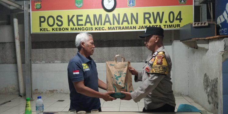 Dalam kesempatan ini Bhabinkamtibmas Kel. Kebon Manggis Aiptu Purnomo juga memberikan bantuan berbentuk sembako berupa kopi, gula dan teh sebagai bentuk Polisi Peduli kepada petugas hansip dalam rangka Program Kerja Mantap dan Taktis Kapolres Metro Jakarta Timur.