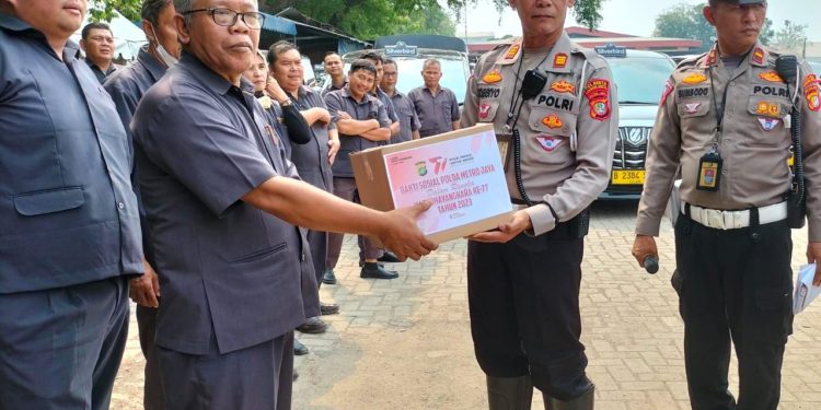 POLDA METRO JAYA – Polresta Bandara Soekarno-Hatta (Soetta) membagi-bagikan puluhan paket sembako untuk para pengemudi di pengendapan taksi, Rabu (21/6).