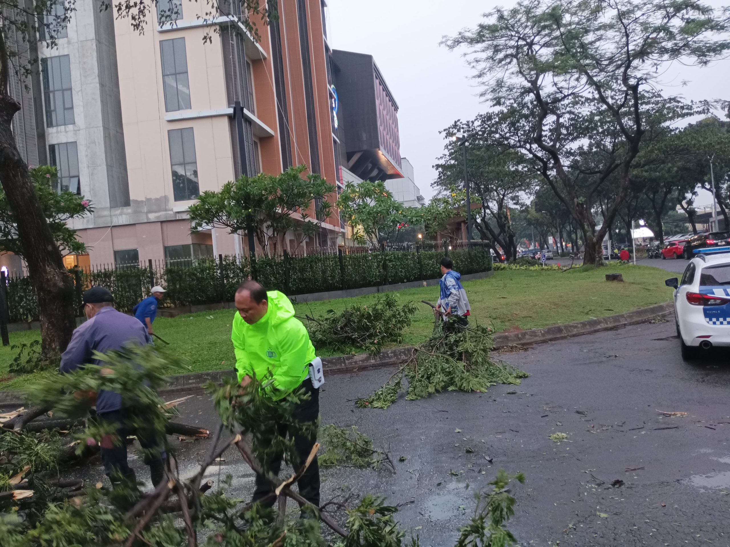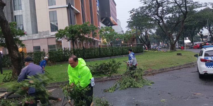 Tangerang Selatan – Pohon tumbang di Jl. Jendral Sudirman, Sektor 9 Bintaro, mengakibatkan kemacetan di depan Trans Park, Senin (11/11/2024).