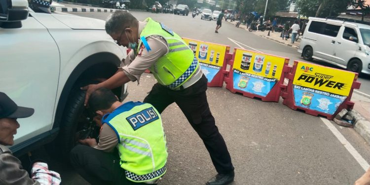 Dengan sigap, kedua anggota Unit Lantas Cengkareng tersebut mulai mengganti ban mobil yang kempes.
