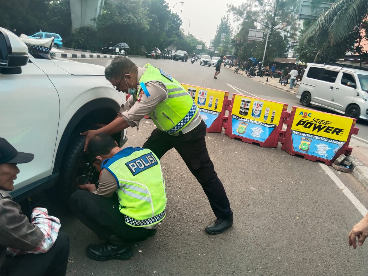 Terlihat dua anggota Unit Lalu Lintas Cengkareng Jakarta Barat, Aiptu Torus Marasi P dan Bripka Wimbo, memberikan bantuan kepada seorang pengendara mobil yang mengalami masalah ban kempes di sebelum traffic light (TL) Cengkareng, Senin, 15/7/2024 sekira pukul 16.00 wib